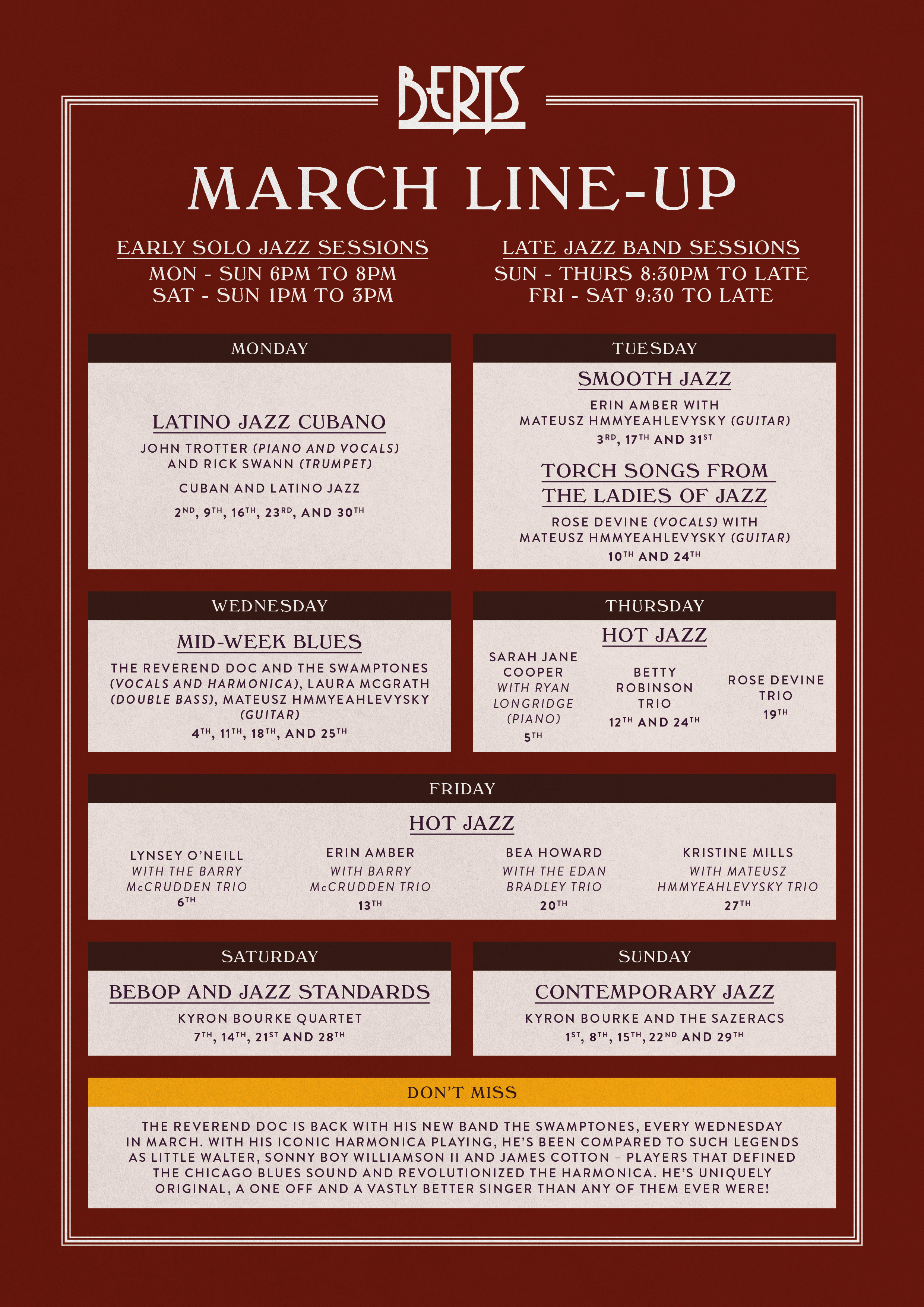 *Please note that on Friday and Saturday evenings there will be a stage charge of £10 per person for reservations from 8.30pm onwards. This will ensure that the table is yours for the evening to enjoy the live jazz music.